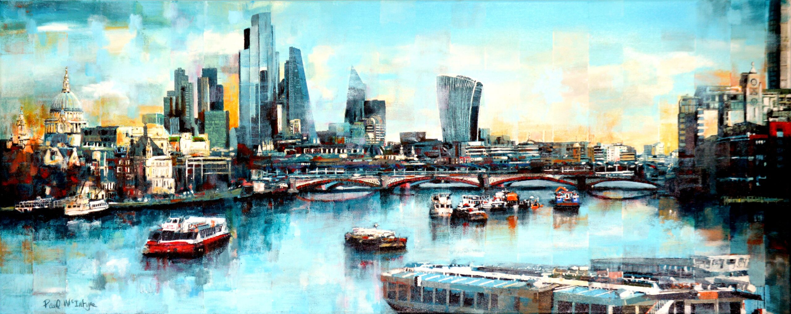 Painting with an uninhibited vigour and freedom, Paul McIntyre‘s paintings vibrate with life, energy and colour. Whilst studying art at Henley College, he was introduced to acrylic paints and has enjoyed working with this medium for many years. Depicting a radiant world of cityscapes, street signs, traffic and people make his work both instantly recognisable and utterly irresistible.